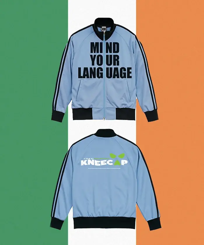 デザイン: 劇中でメンバーが多くのジャージを着用していることに由来したジャージ。フロントに大きく「MIND YOUR LANGUAGE」、バックにKNEECAPのロゴを配置した仕様。