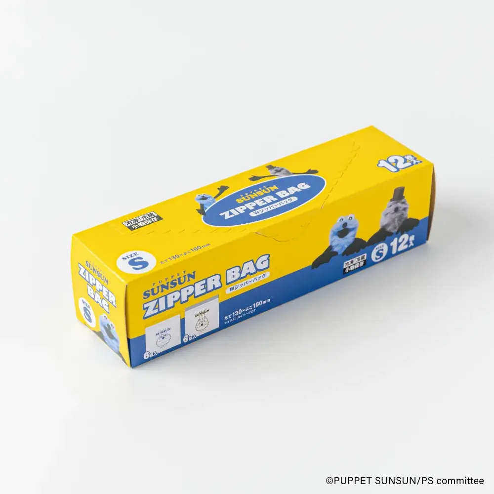 - Wジッパーバッグ(Sサイズ):12枚入り、店頭売価350円(税抜)。収納部分のサイズはタテ13cm×ヨコ16cm。デザインはスンスンとゾンゾンが各6枚。
