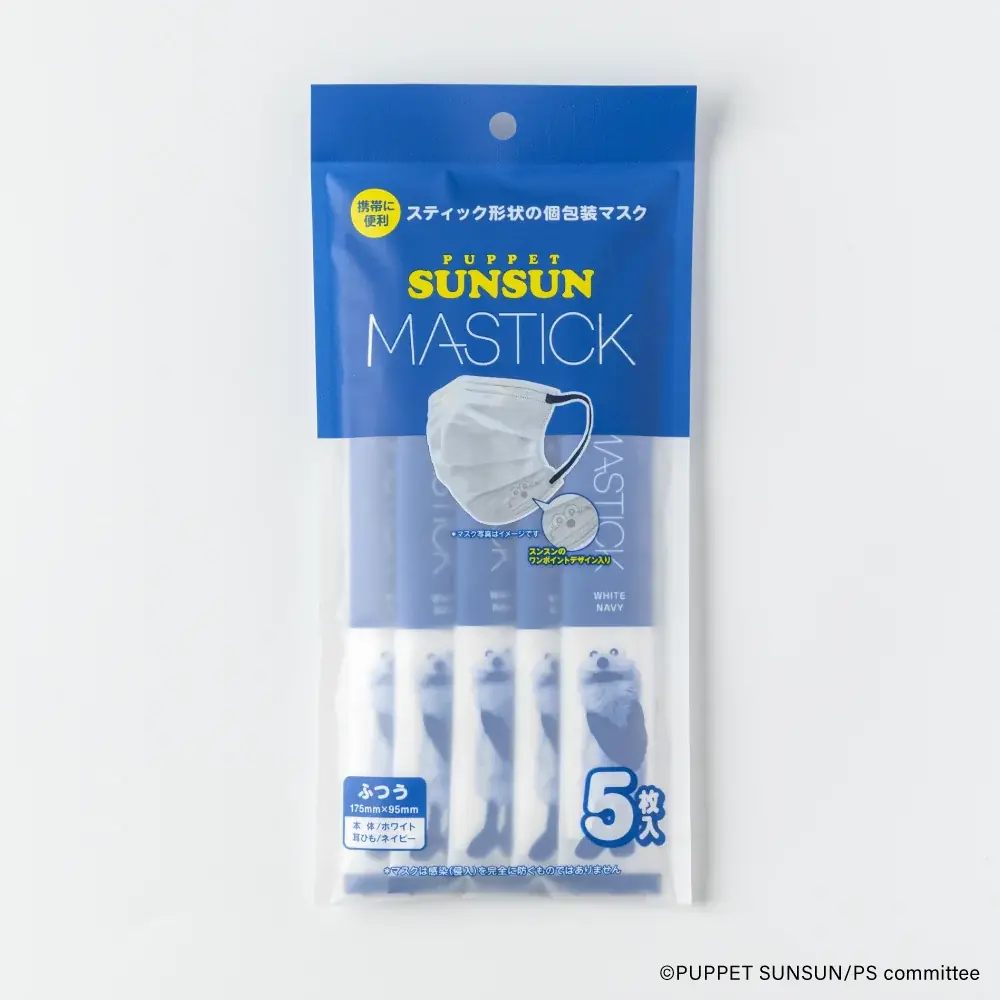 - プリーツ不織布マスク(MASTICK)ホワイト×ネイビー:5枚入り、店頭売価400円(税抜)。個包装は通常の個包装マスクの約1/3サイズ。マスク寸法はふつうサイズ:約175×95mm。サイドをシャープにカットした小顔効果仕様。スンスンの刻印入り。耳紐は6mmのソフトタイプ。