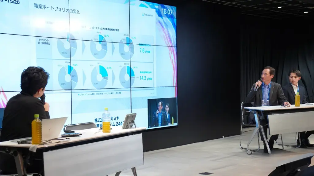 当日はMCが進行役を務め、各上場企業の経営陣と対談する形式でセッションが進行しました。タカミヤ社からは取締役 常務執行役員の安田 秀樹 氏がMCと対談する場面が記録されています。対談形式は企業理解を深めるために設計され、具体的な事業説明や今後の展望について詳細なやり取りが行われました。