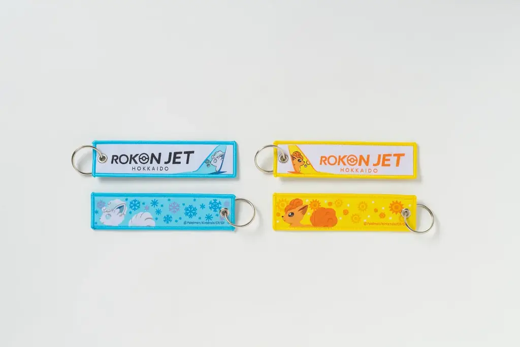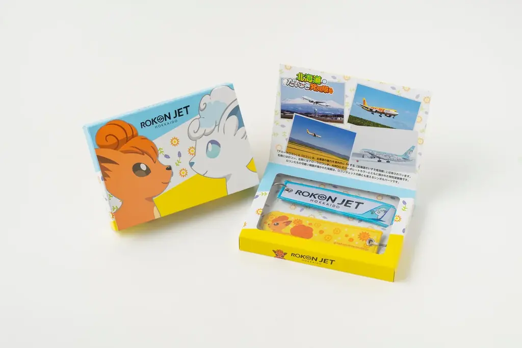 - 『ロコンジェット北海道 フライトタグ2本セット』。アローラロコンとロコンの横顔が描かれた尾翼風デザインのフライトタグ2本組で、バッグに付けたり箱ごと飾ったりできるグッズです。箱にもロコンたちが描かれています。