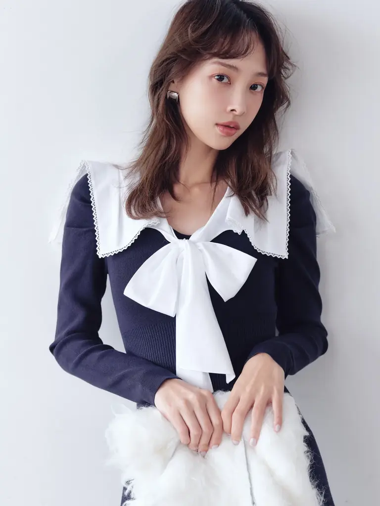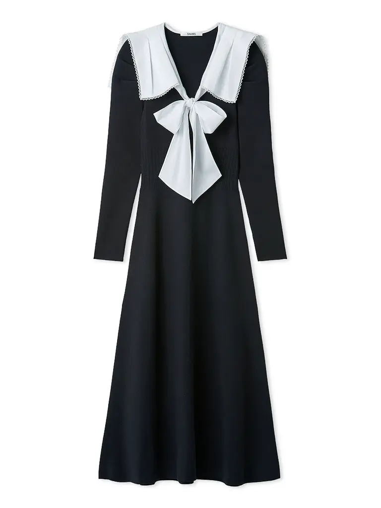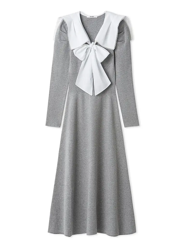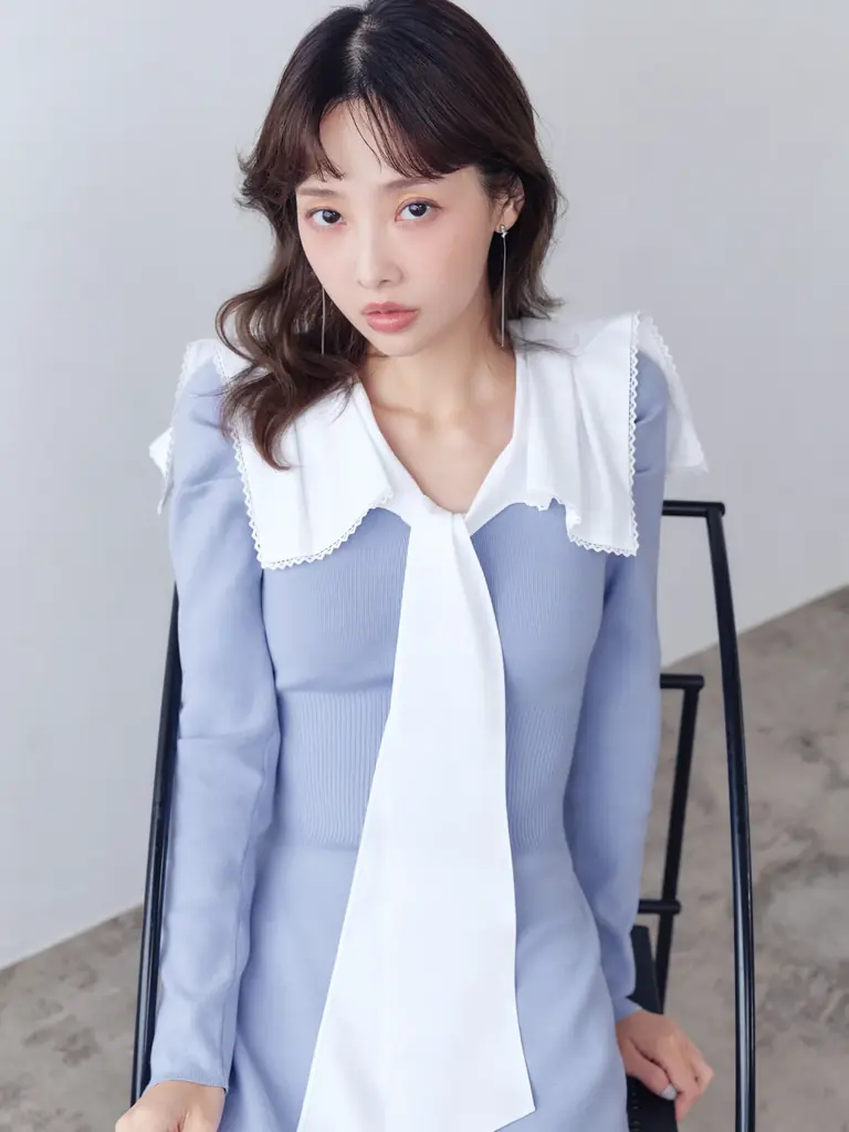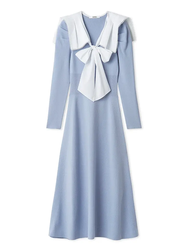 無地のセーラーカラーに織り柄が浮かぶ生地を用い、さらにテープレースを重ねることで上品な華やかさを出したニットワンピースである。フロントリボンが視線を引くアクセントとなる一方、衿にはタックを入れ、動きのある表情を作っている。