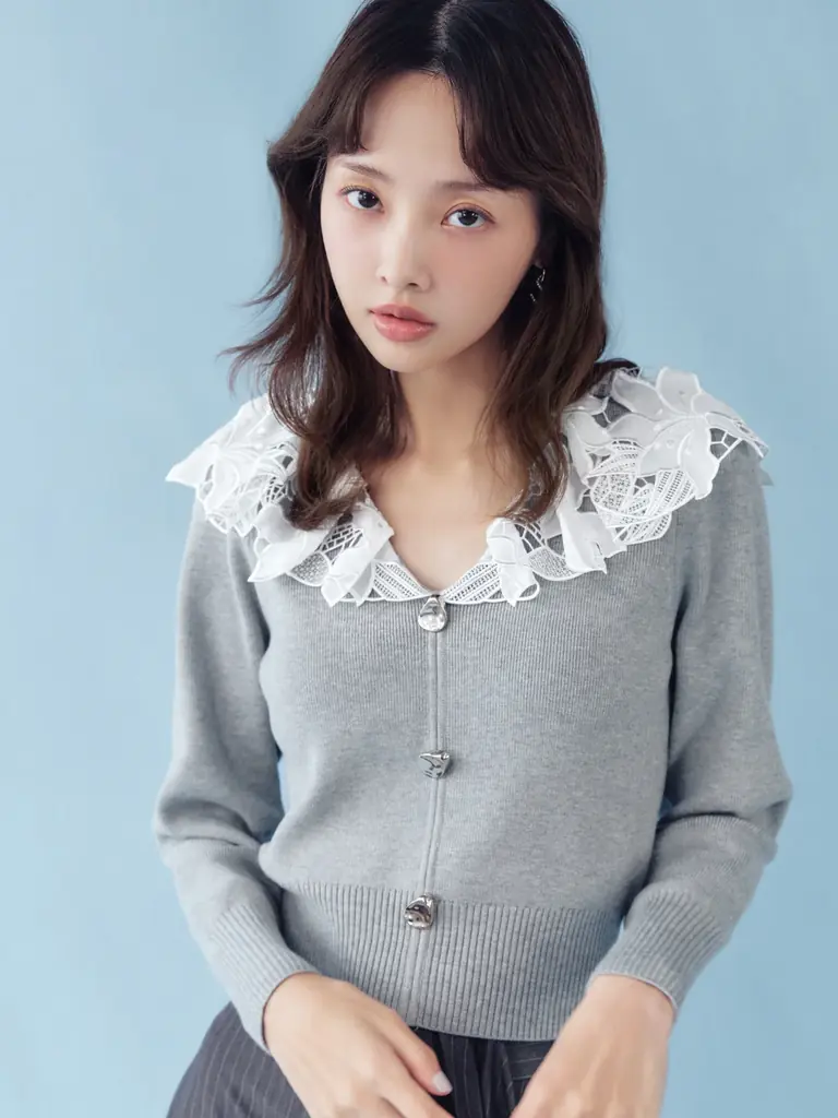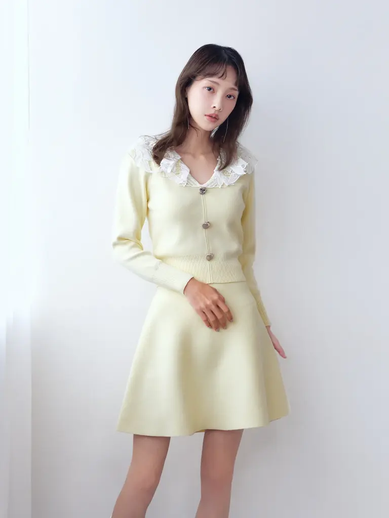 花柄レースのラッフルカラーが印象的なニットと、長めのミニ丈スカートのセットアイテムである。肉厚な編地を採用しており、長い季節に活躍する設計となっている。ニットには意図的にいびつさを残したボタンを配置し、アクセントとしての役割を持たせている。