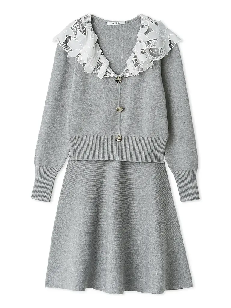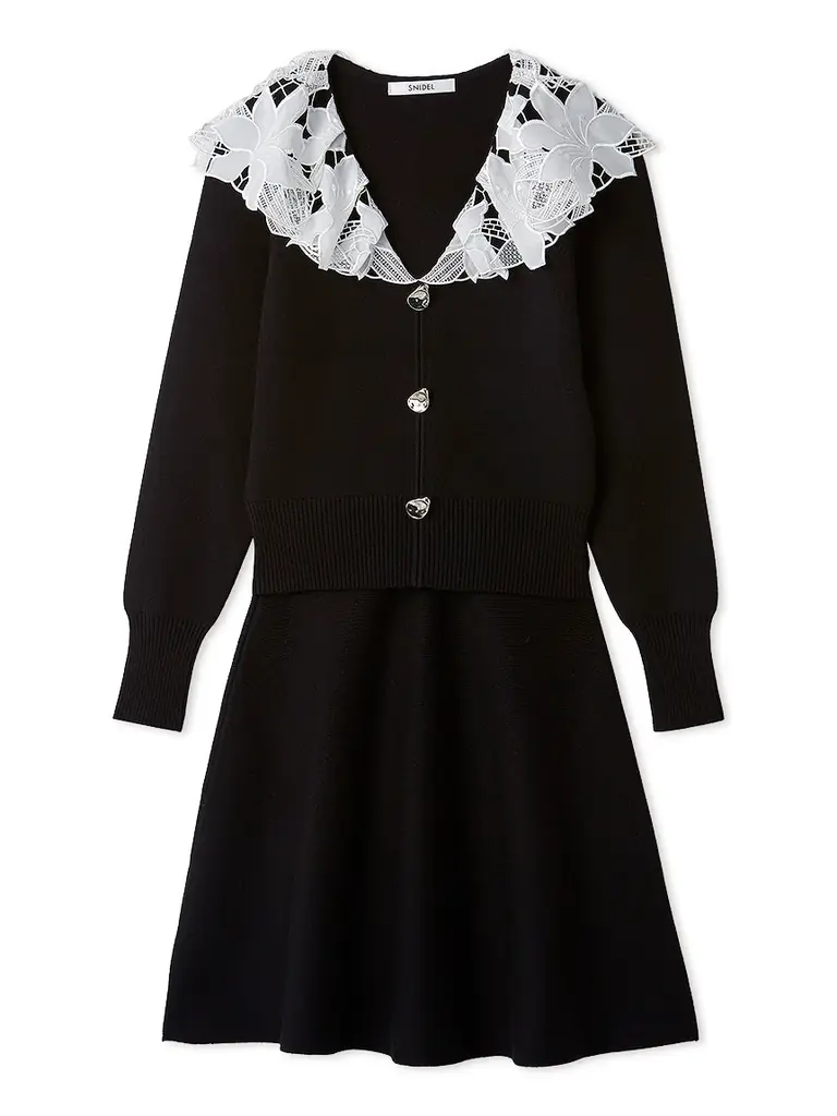 - 花柄レースのラッフルカラー、肉厚な編地、いびつなデザインのボタン、スカートは長めのミニ丈