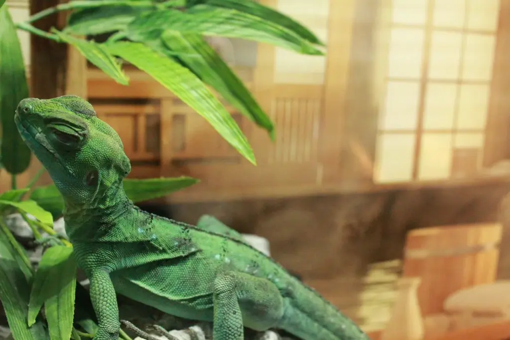 グリーンバシリスクは鮮やかな緑色を持ち、動きの機敏さや独特の鱗の質感が観察のポイントとなります。湿った雰囲気の演出が施された空間で、その生態的特徴が際立つ展示になっています。
