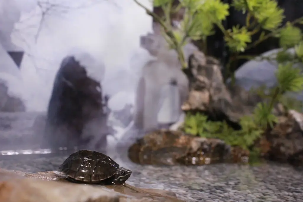 ミシシッピニオイガメは甲羅や動きのかわいらしさが人気のカメ類で、乾いた風合いを感じさせる演出「からから」の空間にマッチした展示です。