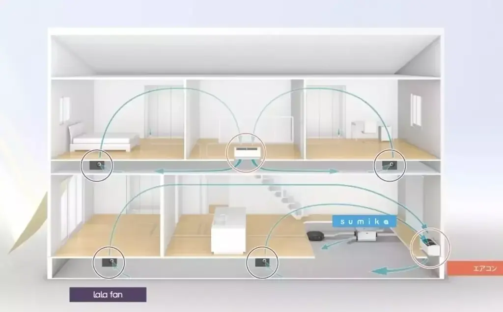 「エアラク」は同社オリジナルの全館空調で、輻射効果を活用し床暖房のようにやさしく空間を温める方式です。居室ごとにブースターファンの風量を個別に調節することで、各室の温度コントロールが可能です。