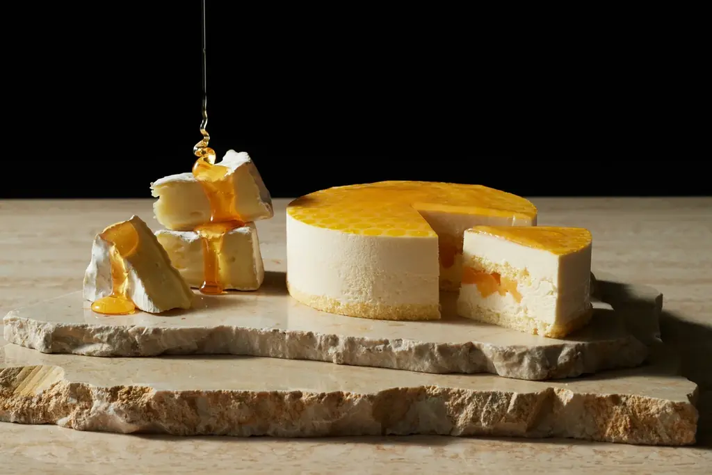 カマンベールムースと蜂蜜ムースの二層構造に、蜂の巣をイメージした蜂蜜ジュレをあしらったハニーチーズケーキ。アクセントにアプリコットを用いて味のまとまりを出しています。