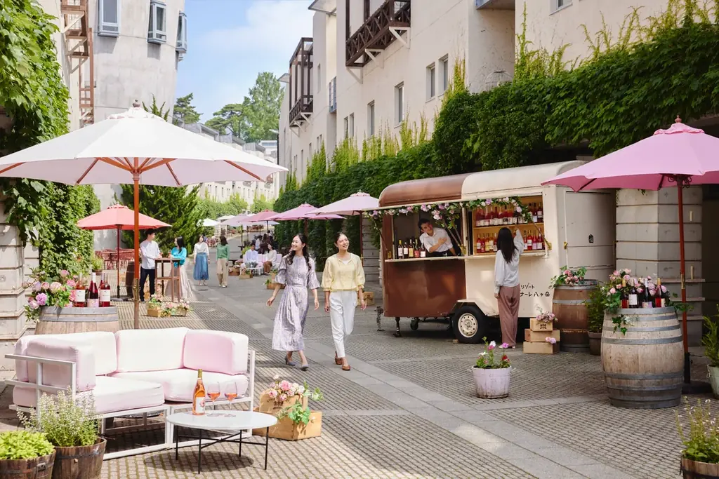 街並みの演出は来訪者が滞在中にゆったり過ごすための空間づくりに重点が置かれています。ソファやパラソルは写真撮影の背景としても配慮され、滞在の記録とロゼワインの多様性を体感する場として機能します。