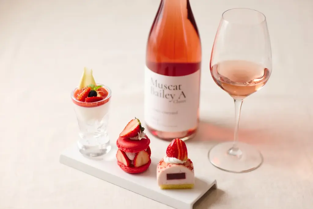 マスカット・ベーリーAのロゼは苺のような香りが特徴で、甘酸っぱい苺のスイーツと組み合わせることで香りが互いに引き立てあいます。カクテルとモクテルはロゼと苺を同時に楽しめる一杯として提供されます。