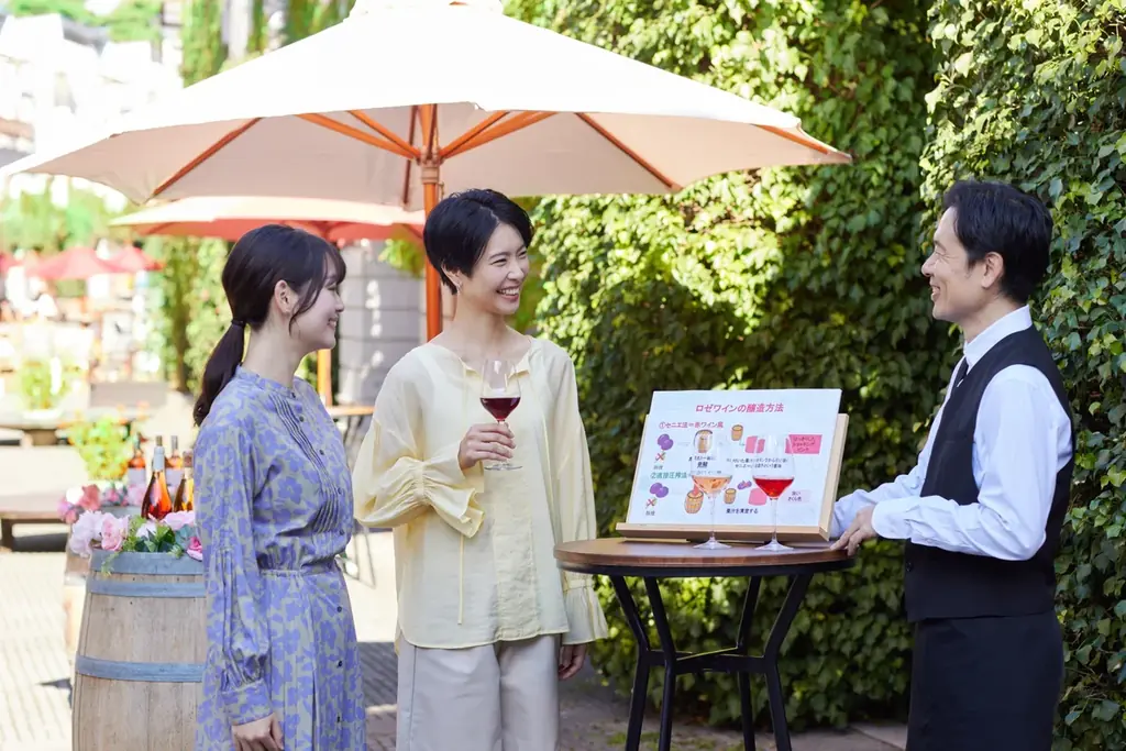 テイスティングでは、マスカット・ベーリーAから造られるロゼの特徴(苺を想起させる香り)や、製法の違いによる香りや味わいの差を実際に試飲しながら学べます。スタッフがそれぞれのロゼのバックグラウンドや製法について説明するため、ロゼに詳しくない人でも気軽に参加できます。