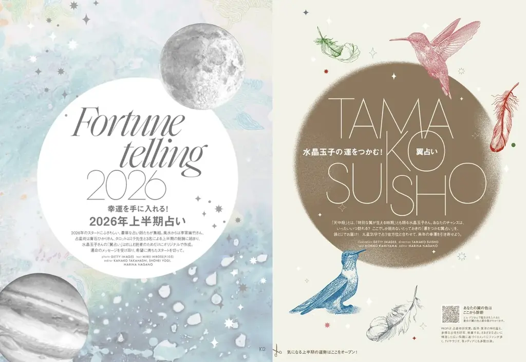 2026年上半期を占う特集では、複数の豪華占い師が参加しています。風水の李家幽竹さん、占星術の青石ひかりさん、タロットのミラ先生による総論に加え、水晶玉子さんの「翼占い」がエルのためにオリジナルで作成され、袋綴じ付録で提供されます。