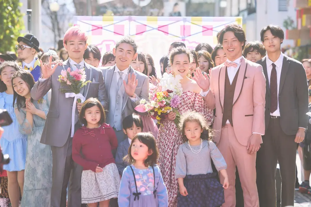 wedding march 2026の中心となる体験は、実際のカップルと地域住民が参加する「まちの結婚式」です。この中で共通して用意される2つの主要コンテンツは、パレード形式の祝福体験「ウエディングロード」と、地域課題を抱える食材を活用した「ウエディングケーキ」です。両コンテンツとも、まち全体が祝福の場となることを目指して設計されています。