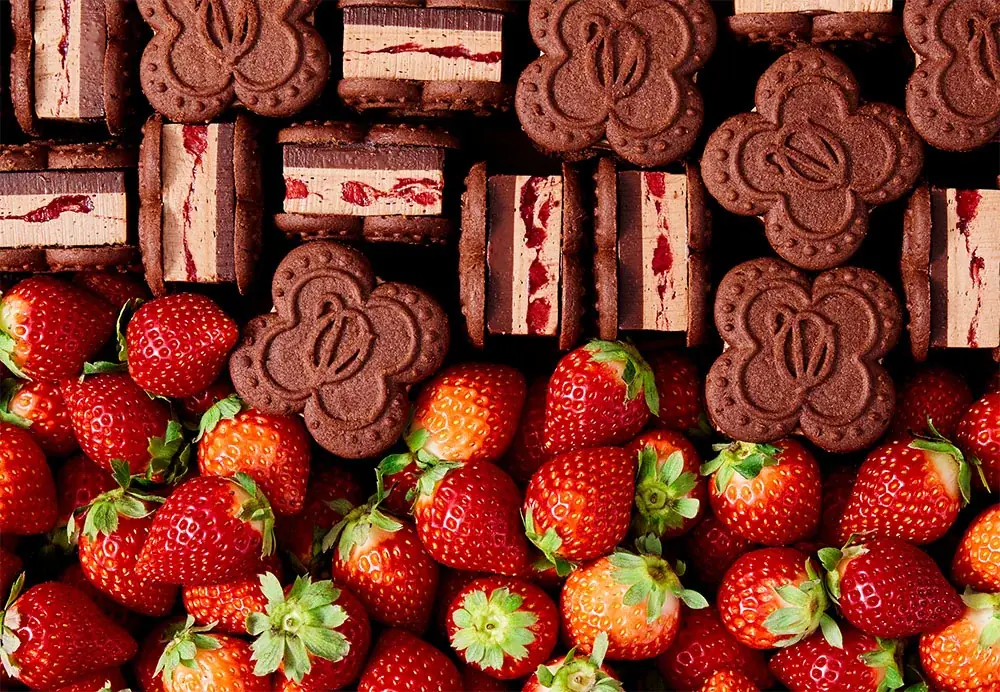 使用するいちごは、香りがよいとされるサンアンドレアス種の果肉を、苺ピューレで煮込んだコンフィチュールジュレとして配合しています。これにより苺のジューシーさと酸味が生かされ、濃厚なショコラと調和するよう設計されています。