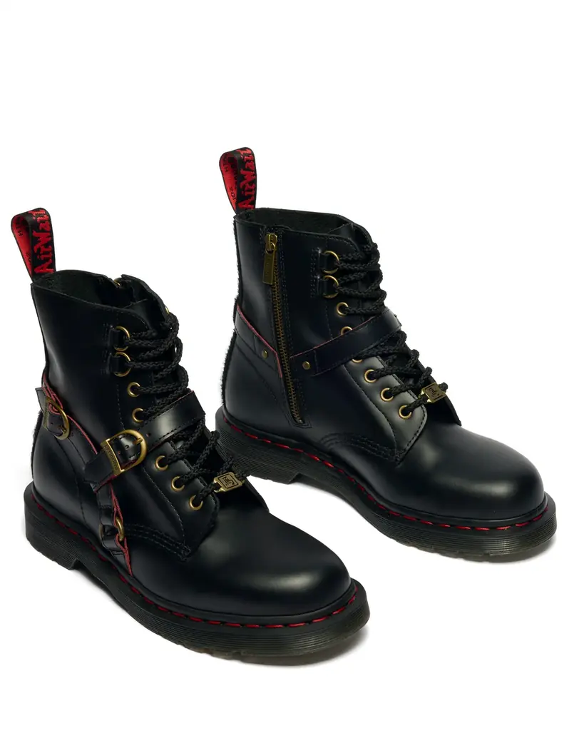 1460をベースにしたブーツモデルでは、ライディングブーツを連想させるハーネスストラップを採用しています。ストラップには2つのアンティークゴールドのバックルと管が付され、アイレットとDリングも同様にアンティークゴールドで統一されています。