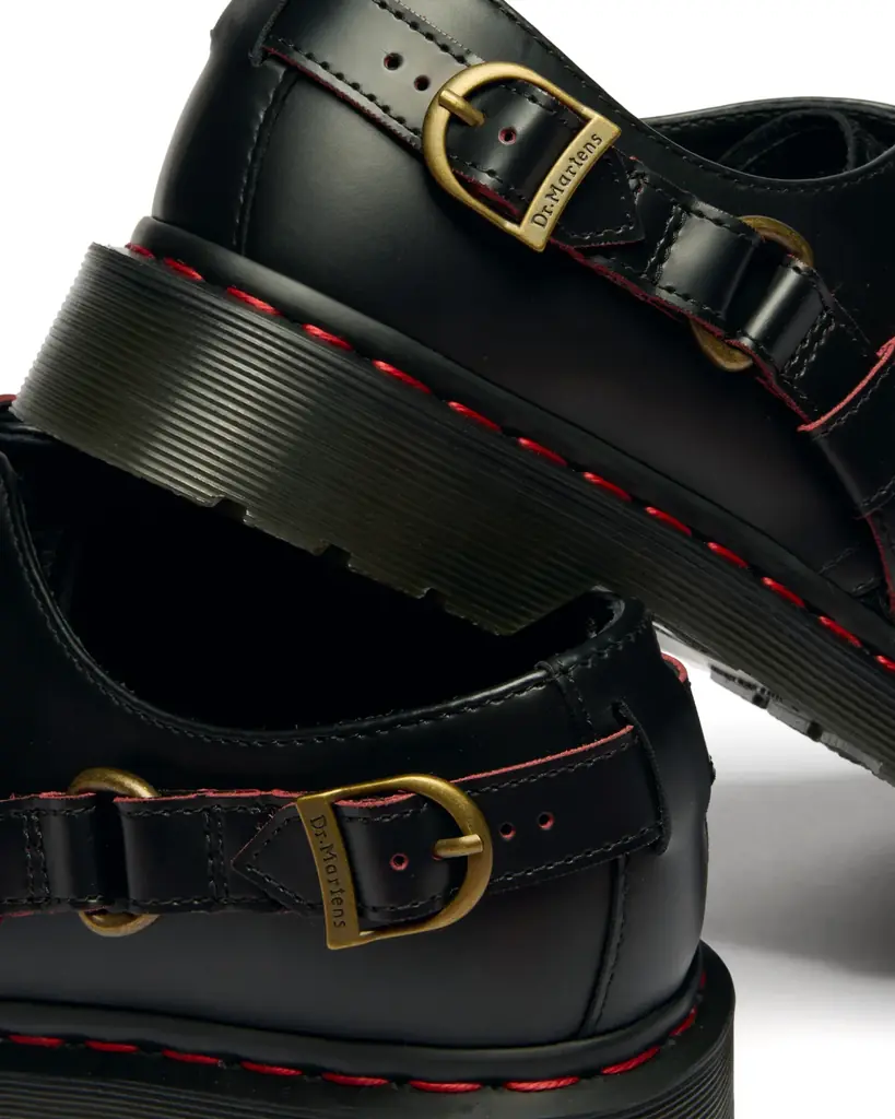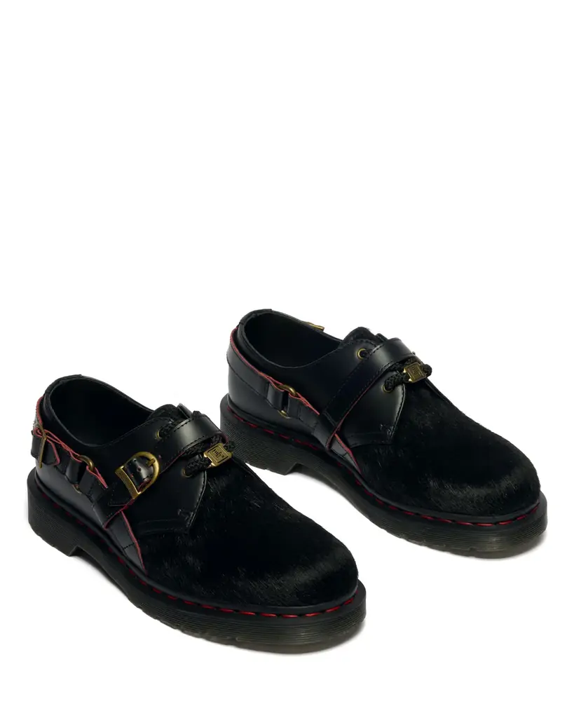 1461シューズをベースにしたモデルもブーツ同様のハーネスストラップとアンティークゴールドのハードウェアを装備しています。ヴァンプ(甲部分)に黒のヘアオンレザーを使用し、同様にレッドのウェルトステッチとヒールループが配されています。