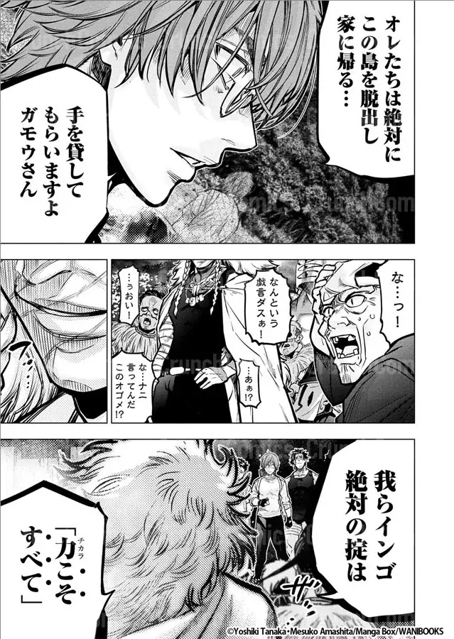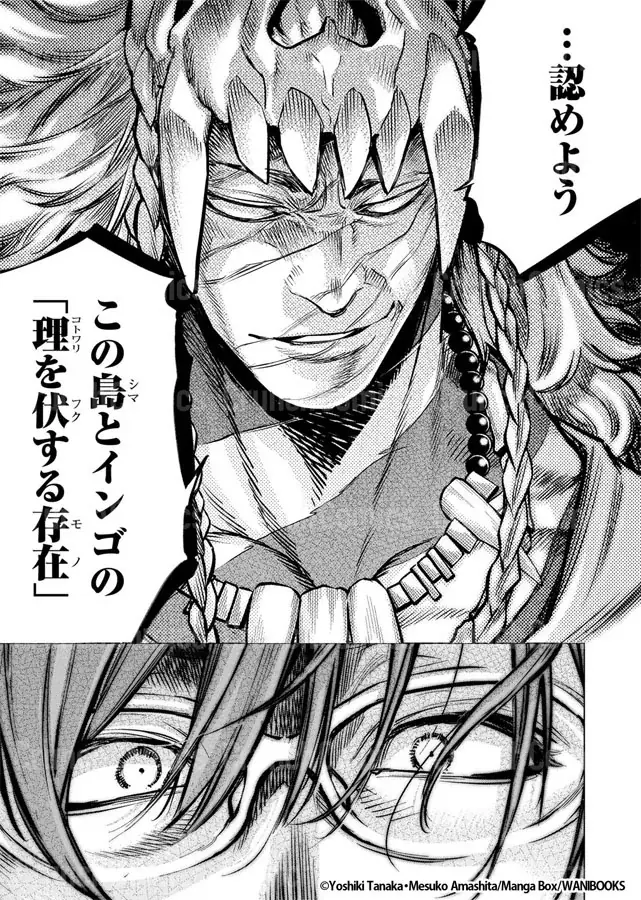 ガモウに有利な状況を作り出すため、王母・チオモやガモウ側の将〈タスク〉衆を人質に取った啓太は、「全員が無事に島から出る」ことを条件に取引を試みます。ガモウは啓太の智謀を認め、啓太を一人の将〈タスク〉として「ツワモノ」と呼びますが、提示された条件は各地の領〈カンシ〉を守る将〈タスク〉たちと死合うことでした。