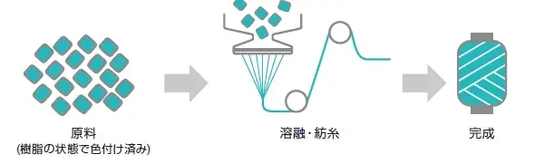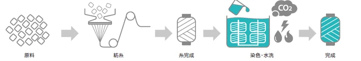 DopeDyedは、糸となる樹脂段階で着色を行う方法で、後工程での大量の水使用や薬品処理を削減できる。一般的なポリエステル糸の染色工程と比較して、水使用量・薬剤使用・染色工程におけるCO2排出を抑制できる点が挙げられている。また、繊維自体に着色されているため色落ちしにくい利点もある。