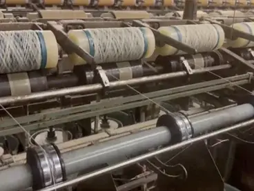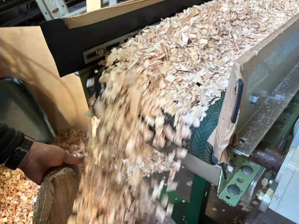 - シート化と撚糸化:粉砕された木くずをシート状に加工し、細く切断してスリット撚糸(ねんし)にする。
