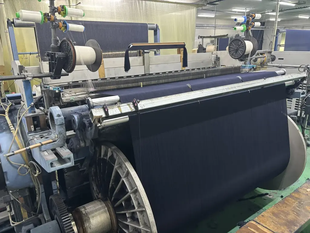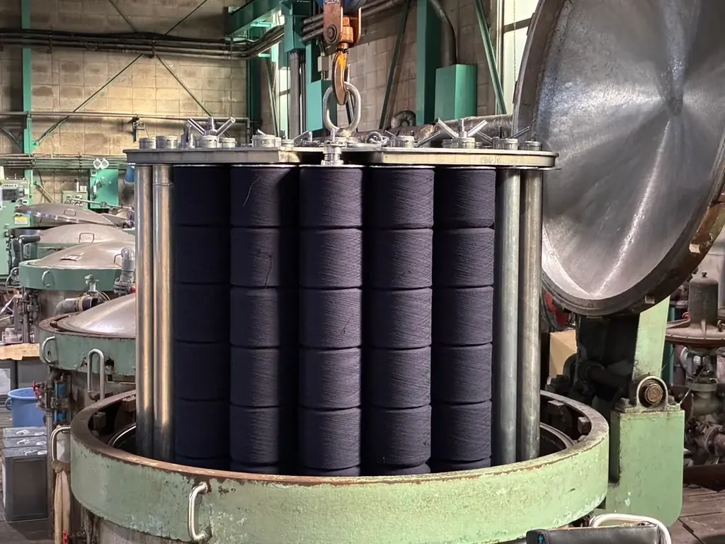 - 染色と織り:スリット撚糸を藍色に染色し、織ってデニム生地へ加工する。