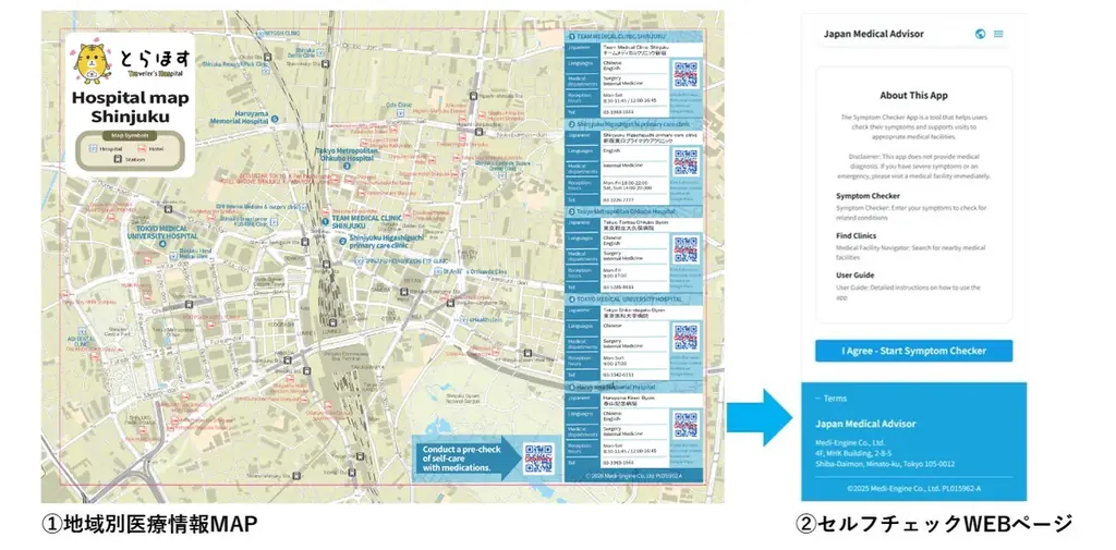 実施期間は2025年12月25日~2026年3月31日で、必要に応じて延長の可能性があります。実証エリアは東京都内の新宿、渋谷、浅草、六本木の4エリアに限定して運用されます。対応言語は英語と中国語(簡体字)です。利用ツールは「医療機関マップ」と「セルフケア診断WEBアプリ」で、WEBアプリのURLは次の通りです: