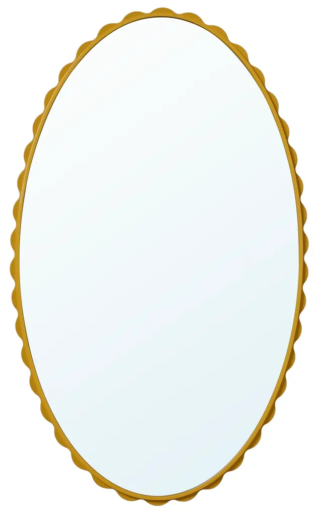 - フリルのような縁取りを持つ装飾的なミラー。壁に生き生きとした印象を与えるデザインで、イエローは活気ある雰囲気を加えます。縦横どちらでも使え、シリーズで揃えることで装飾的な統一感を演出できます。