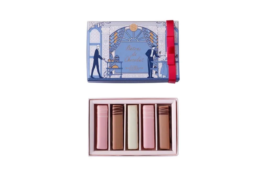バトンショコラはスティック状のショコラで、サクサクとしたクランチ食感がアクセントになっています。3種のチョコレートで包んだ構成により、食感と風味のコントラストが楽しめます。
