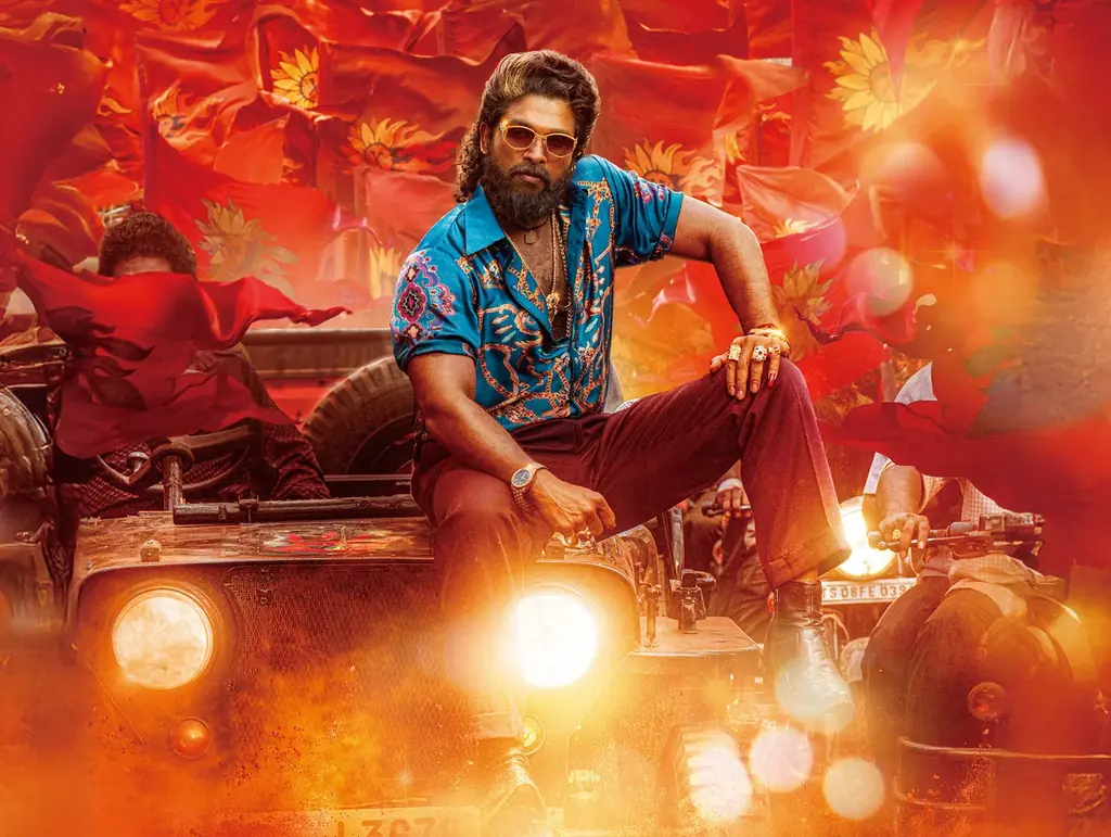 今回解禁された場面写真は、主人公プシュパの成り上がりと抗争の気配を色濃く表現しています。写真は複数点が公開され、プシュパの威風堂々とした立ち姿や、バイクや赤い旗に囲まれた場面、車のボンネットに腰かける姿などが含まれます。