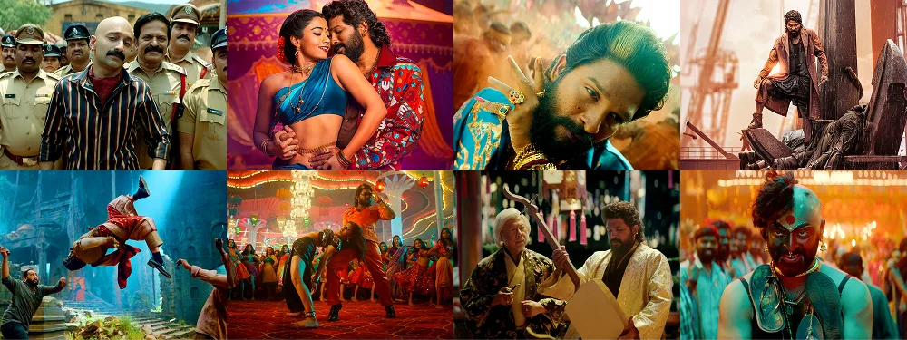 写真のなかには、プシュパへの復讐に燃える警視シェーカーワト(ファハド・ファーシル)の不敵な笑み、プシュパが最も愛する妻シュリーヴァッリ(ラシュミカー・マンダンナ)の柔らかな表情、宙返りによるアクションシーンやダンスシーンなど多彩なショットが含まれており、物語のコントラストが視覚的に伝わる内容です。