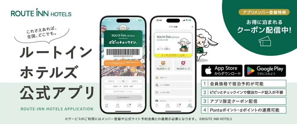ホテル開業を記念して、ルートインホテルズ公式アプリでは新規ホテルオープン記念のクーポンを配信しています。クーポン利用にはアプリのダウンロードと会員登録が必要で、利用条件や注意事項はアプリ内のクーポン画面で確認するよう案内されています。