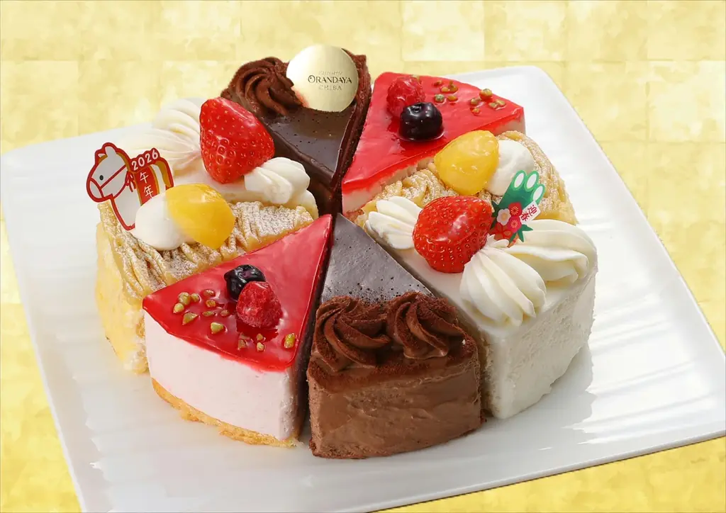 内容:苺ショート・ガトーショコラ・マロンケーキ・ラズベリーレアチーズの4種類をセットにしたお正月限定デコレーション。華やかな彩りで年始の集まりに適したアソートである。