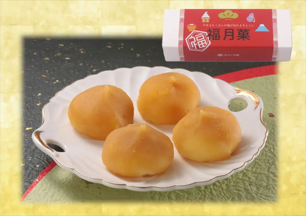 内容:紅白の薯蕷饅頭(じょうよまんじゅう)に“福”の焼印を押した商品。紅生地にはつぶ餡、白生地にはこし餡を充填している。