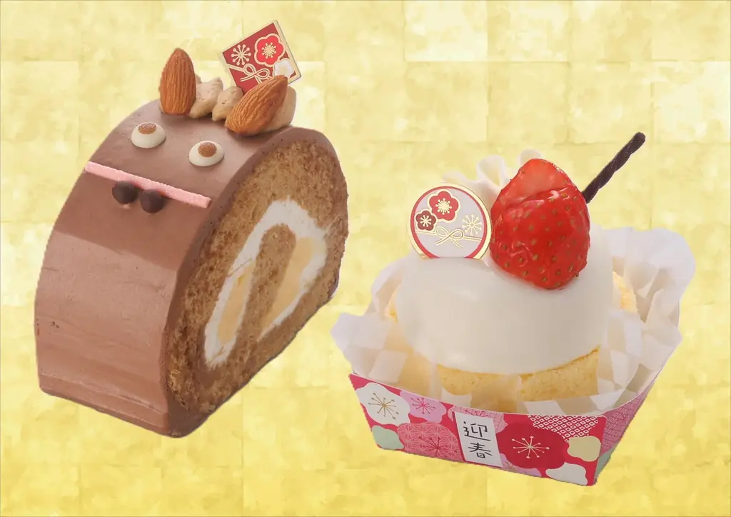 内容:干支をモチーフにしたロールケーキ(うま)と、紅白の配色がめでたい「迎春いちごとほうじ茶」のカットケーキを用意。