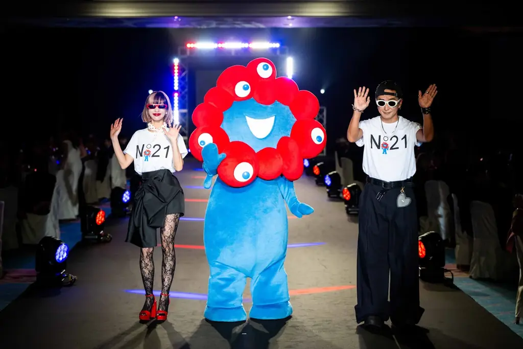 ステージにも大阪・関西万博公式キャラクター「ミャクミャク」が登場し、N21とのコラボレーションTシャツを披露しました。ミャクミャクとコラボTシャツを着たモデルの奈良裕也、AYAがランウェイを歩き、後半には紗栄子が登場して1月14日から阪急うめだ本店「コトコトステージ11」で開催されるポップアップの告知が行われました。N21とミャクミャクのスペシャルコラボTシャツはモノトーン2色展開で、同イベントで受注販売されます。