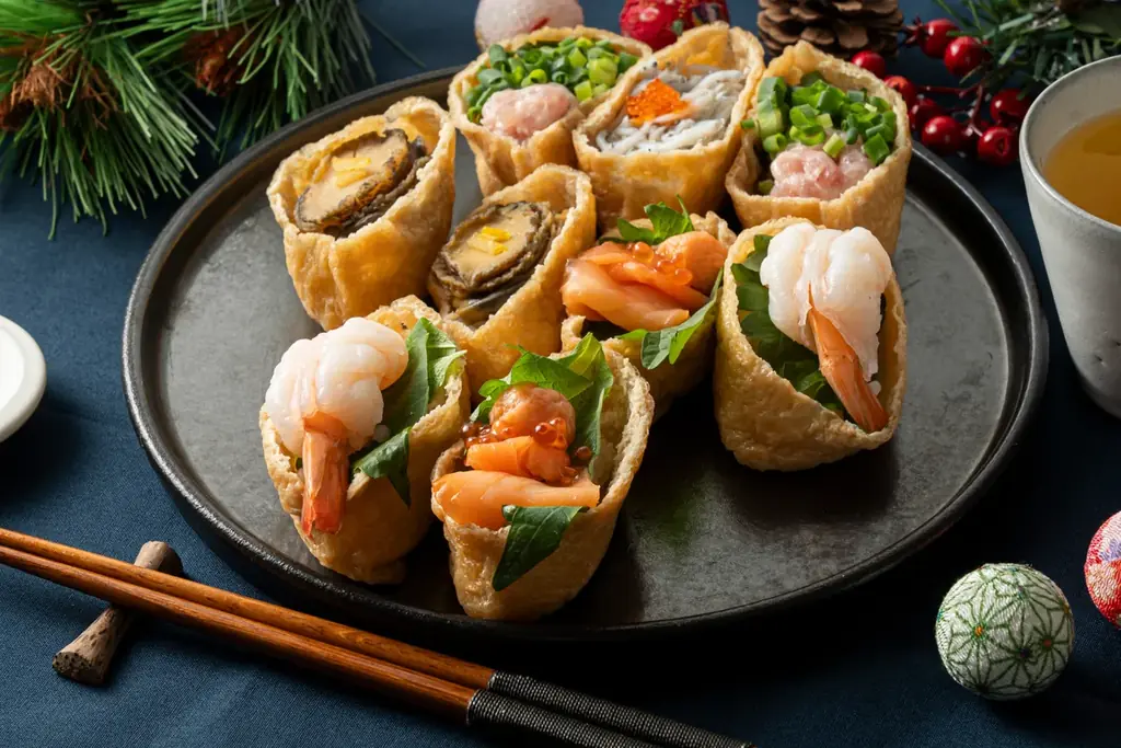 - バラエティセット 雅 — 鮑を使用したいなり寿司を加え、年末の特別な一日にふさわしい贅沢感を演出した仕立て。