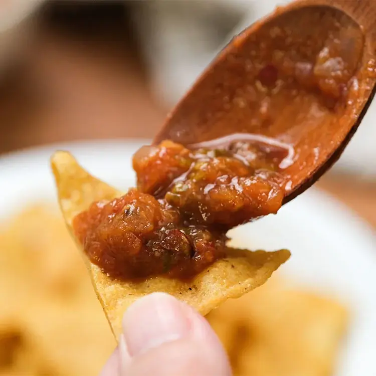 サルサの原材料は以下のとおりです。辛みは穏やかで、香ばしさと酸味、コクがトルティーヤチップスの甘みと自然に重なるバランスを目指しています。
