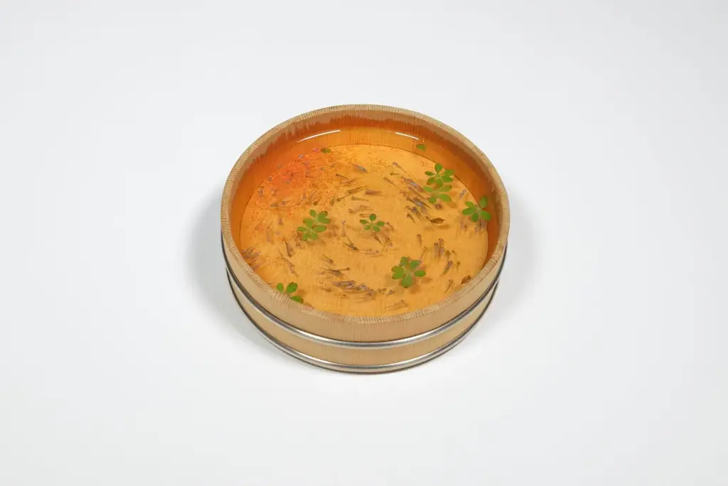 - 「雨星」:人間国宝・中川清司氏の木桶、超難黄変エポキシ樹脂、アクリル絵具。径16.5×高さ5.7cm。価格 3,740,000円(税込)。
