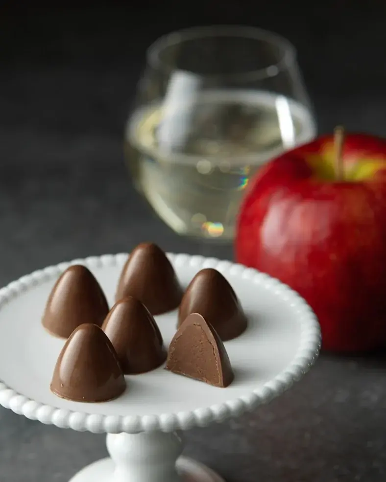 北海道余市産りんごを使用したシードルをガナッシュに練り込み、シードルの香りが立つように仕上げたチョコレートです。柔らかな食感と芳醇なリンゴの風味が特徴で、アルコールは1%未満含有しています。