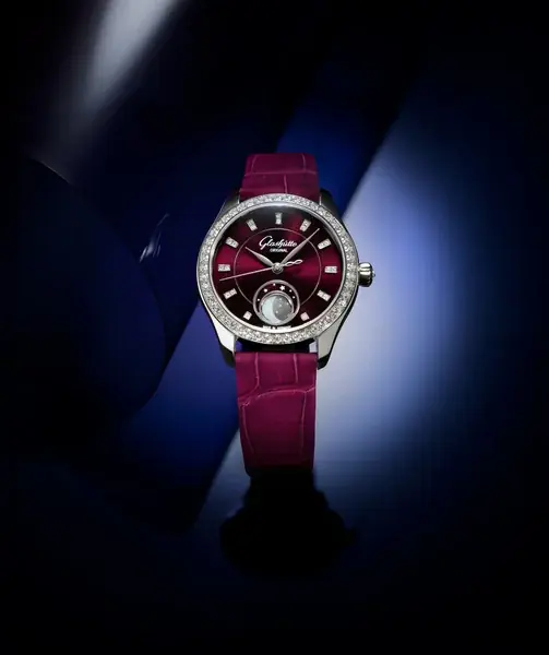 グラスヒュッテ・オリジナルは、直径32.5 mmのラウンド型ステンレススティールケースに収まるレディスモデルとして、セレナーデ・ルナの新作を発表した。この新作は、文字盤とレザーストラップに採用された鮮やかな「パープル ベルベット」カラーを最大の特徴とし、夜の装いから日常のビジネススタイルまで幅広くアクセントを添える意図でデザインされている。