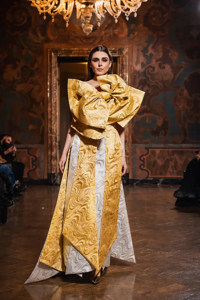- パリ・ファッションウィークで発表された最新コレクション。伝統美と現代フォーマルの象徴的ルックを収めた一枚。