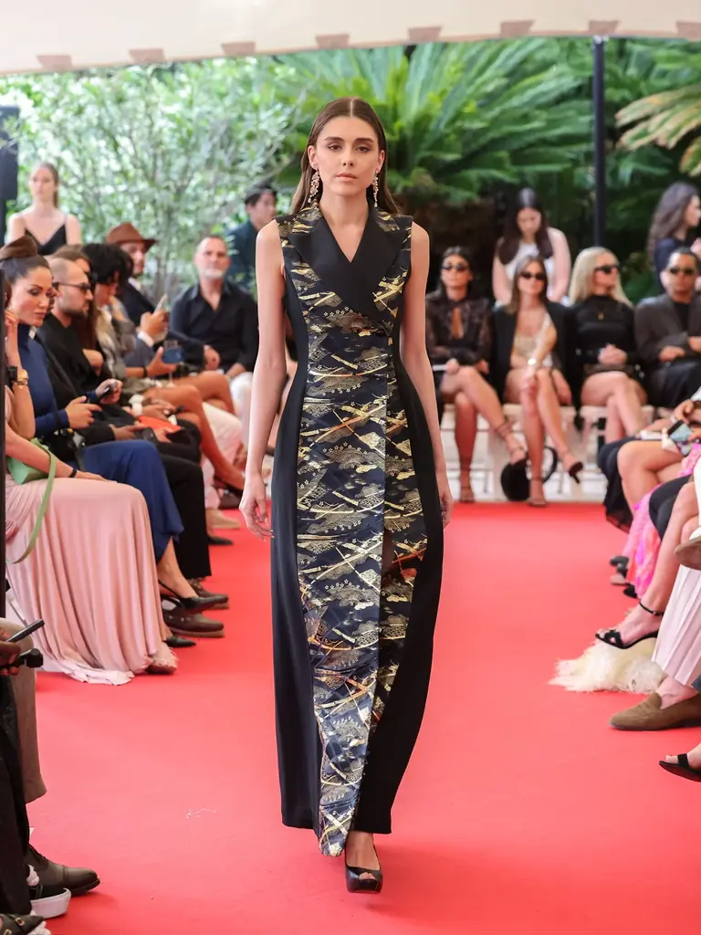- カンヌ映画祭期間中のショー写真。国際ゲストを前に西陣織によるラグジュアリーフォーマルドレスを披露した場面。