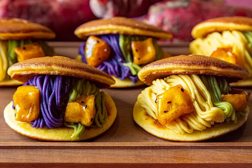- 〈福井〉お芋スイーツ専門店フランダースフリッツ/抹茶&焼き芋の2層モンブラン生どら焼き[紅芋、シルクスイート](各1個)801円。