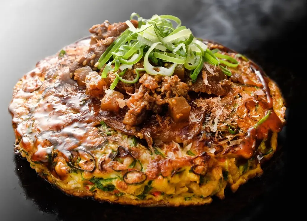 - 牛すじねぎふわふわ(1枚)1,458円。山芋を使った厚みのあるふわふわの生地にねぎと牛すじ、ソースが調和。
