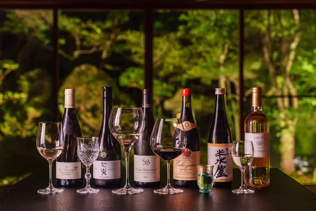 提供の際は懐石の形式を基本とし、食材に合わせた日本酒やフランスのワイン(シャンパーニュ、ブルゴーニュ、ボルドーを中心)でのペアリングを推奨している。ソムリエが銘柄を選定し、料理との相性を考慮したセレクションを揃えている。