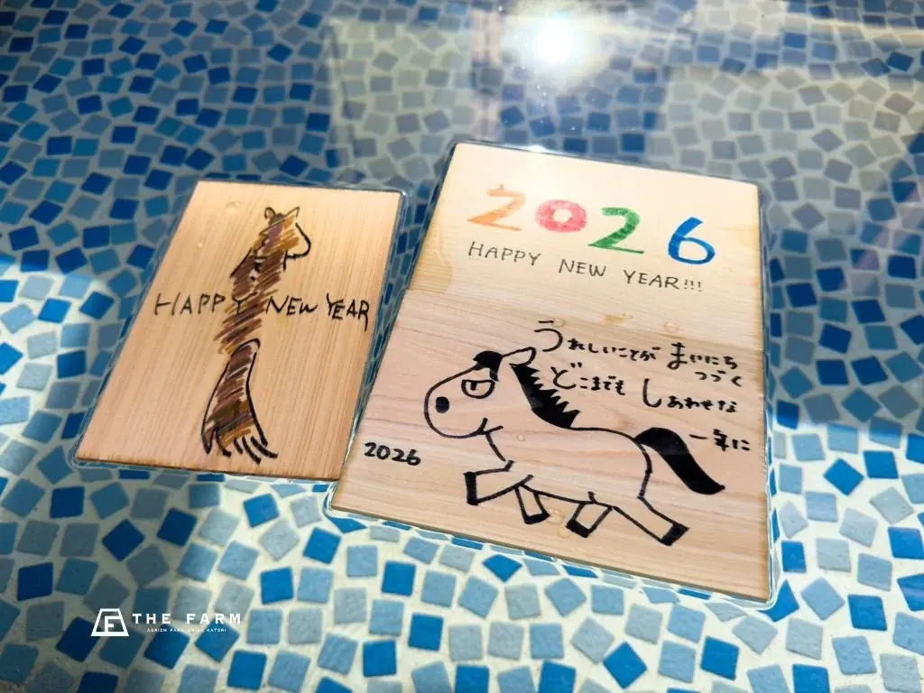 年賀状風呂で使用される「年賀状サイズのヒノキの入浴木」は、THE FARMで働くスタッフが一枚ずつ気持ちを込めて書き入れたものです。入浴木には埼玉県ときがわ町のヒノキ間伐材が使われ、木の香りとともに新年の挨拶が湯気の中で受け取れるよう演出されています。