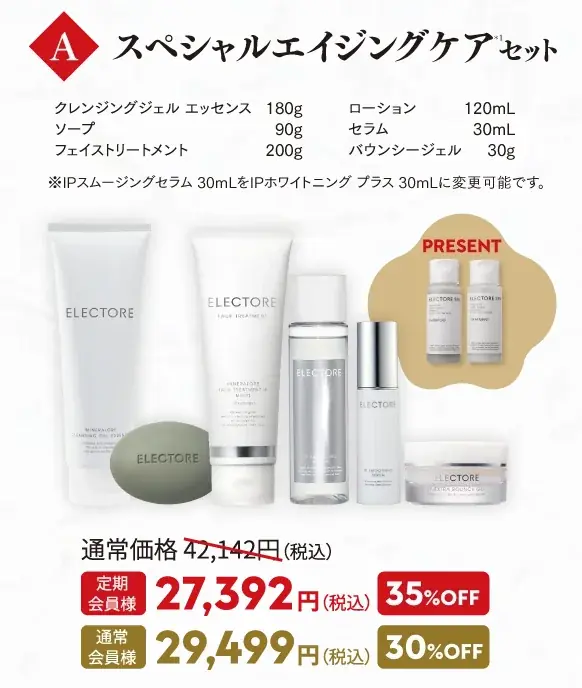| セットA:スペシャルエイジングケア*¹ | クレンジングジェル180g、ソープ90g、フェイストリートメント200g、IPバランシングローション120mL、IPスムージングセラム30mL(※IPホワイトニング プラス30mLに変更可)、IPエクストラ バウンシージェル30g | ミニ シャンプー50mL+ミニ トリートメント50g | 42,142円 | 27,392円(35%OFF) | 29,499円(30%OFF) |