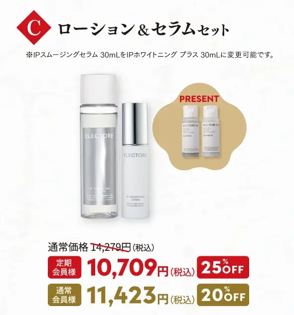 | セットC:パーツのうるおいに特化 | IPバランシングローション120mL、IPスムージングセラム30mL | ミニ シャンプー50mL+ミニ トリートメント50g | 14,279円 | 10,709円(25%OFF) | 11,423円(20%OFF) |