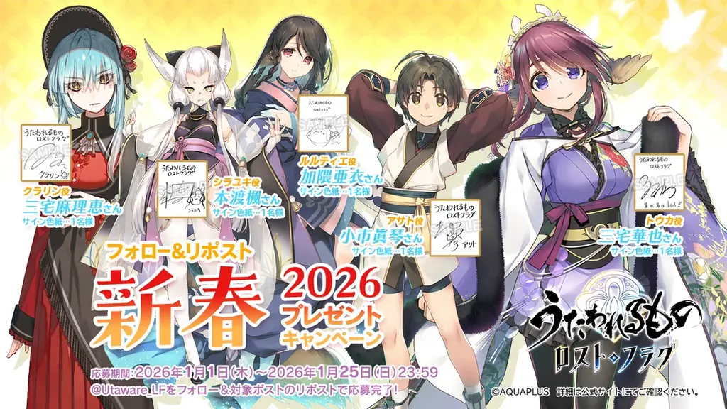 | フォロー&リポスト キャンペーン | 応募期間:2026/1/1 ~ 2026/1/25 23:59 / 賞品:直筆サイン色紙(5名) / 応募方法:公式X(@Utaware_LF)をフォローし、キャンペーン投稿をリポスト |
