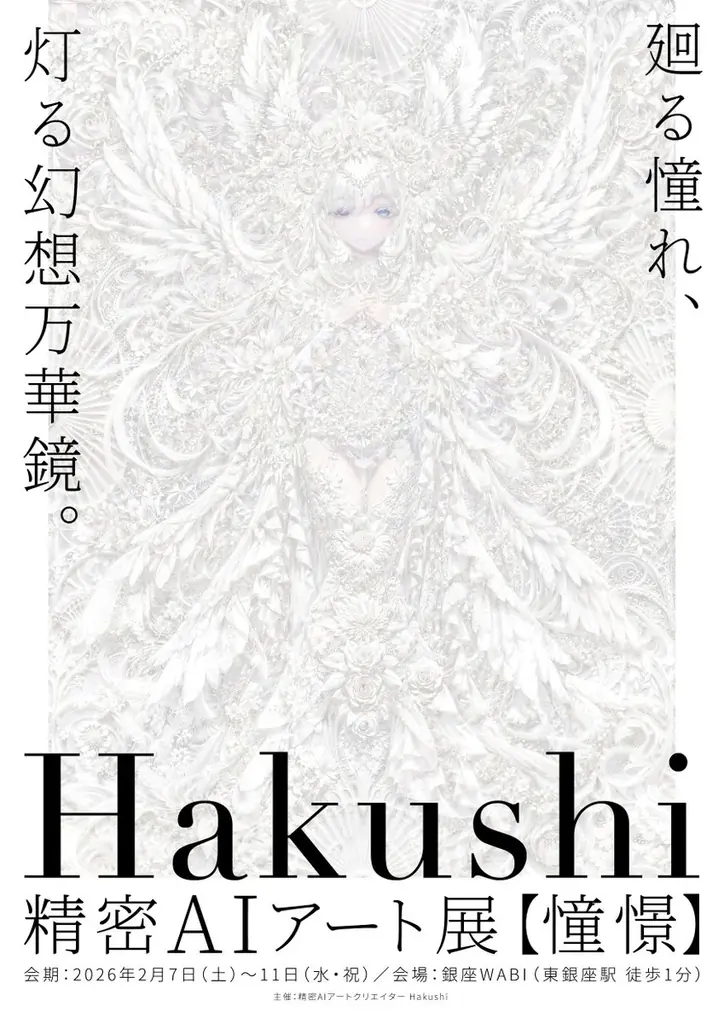 | 個展 | 精密AIアート展【憧憬】 銀座 Gallery WABI(東銀座駅 徒歩1分) 会期:2026年2月7日〜11日 |