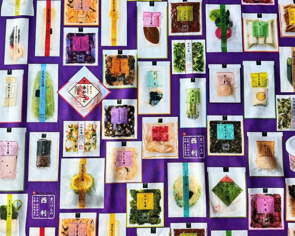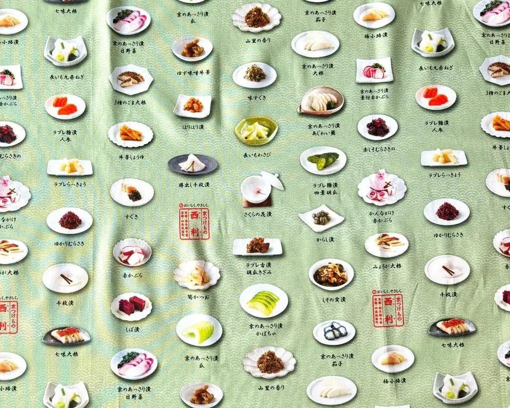 今回制作された生地は、京つけもの西利の代表的な商品やパッケージをデザインモチーフに使用した2種類の柄です。ひとつは京漬物の代名詞とも言える「千枚漬」などの漬物を名称付きで配した柄